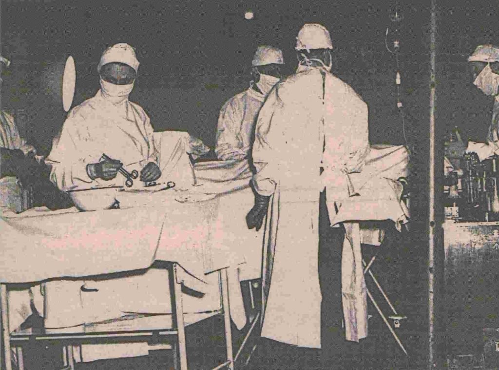 Over the next five months, the hospital moved a total of seven times as it followed the Allied armies across France and Holland. In the second week of October, the unit arrived at Eindhoven in Holland sharing winter quarters in an abandoned German naval hospital with a British MFH. A hospital routine was quickly established whichallowed the staff to incorporate an intensive welfare program for the patients which included a library, games and various clubs operating with “donated” equipment. The hospital routine was rudely shattered on 1 January 1945 when the Luftwaffe attacked the airfield at Eindhoven. By the end of the day over 40 casualties suffering from bullet wounds and burns had arrived at the hospital. There they were to remain for longer than normal because the German attack had destroyed many of the air evacuation aircraft. Two days later, things were back to normal and the seriously injured patients were flown to England.