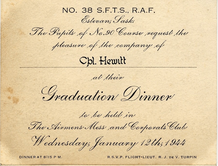 RCAF.Info » Course List by School » No 38 SFTS » Course No 90 No 38 Service Flying Training SchoolCourse 90 Start Date: Unknown Graduation Date: 12 January 1944 RCAF Station Estevan Nominal Roll Graduation Dinner Invitation Card to Cpl HewittCourse 90, No 38 SFTSEstevan, Saskatchewan Leave a Reply Cancel replyCommentEnter your name or username to comment Enter your email address to comment Enter your website URL (optional) Save my name, email, and website in this browser for the next time I comment.