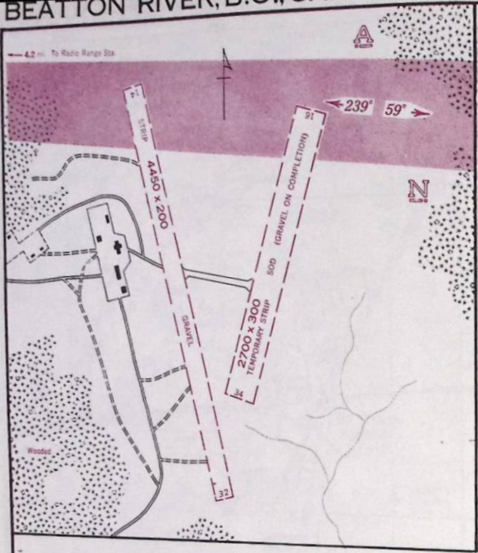 Lat. 57 deg 20’N, Long. 121 deg 38’W (note: this location when typed into google maps is approximately 10-12 km west of the current location of the Beatton River Airport, the location showed on the google map below is the location of the current Beatton River Airport which i believe is one and the same)